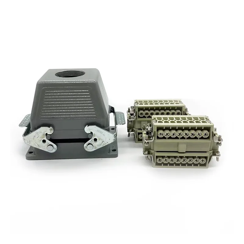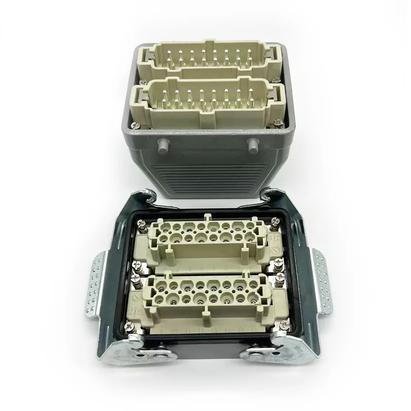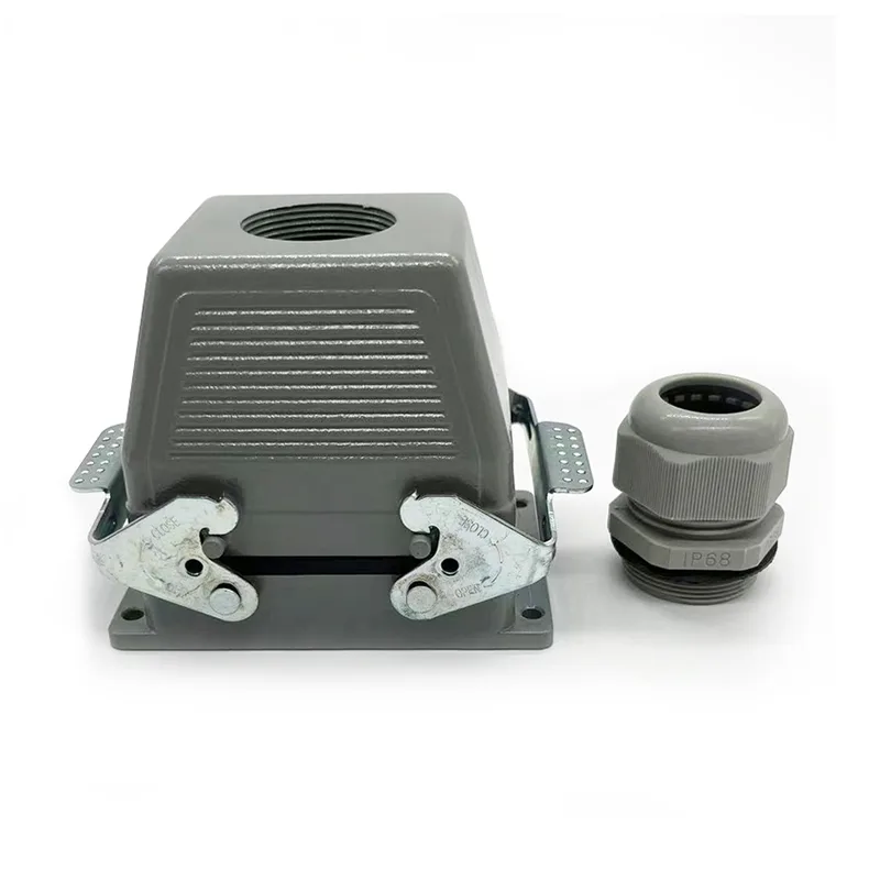 32 Pins TG Heavy Duty Connectors er en mannlig topphusdel. Den skal jobbes med hanninnsatsdeler eller hunninnsatsdeler. Normalt vil det bli fikset med to stykker HE-016-M, men noen spesielle kunders forespørsel om å montere med to stykker HE-016-F. Det er også hus for HSB-016. IP65 vanntett funksjon gjorde det til det som kan brukes utendørs. 32-pinners TG Heavy Duty-koblinger er matchet med PG29. Hvis kunder har forskjellige forespørsler om kabelgjennomføringsstørrelse, kan vi godta og bestille å produsere.