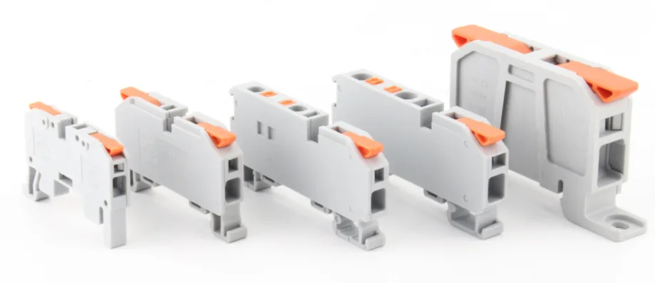 Din Rail Skjøte Wire Hurtigkoblinger Med Spaker er velkjente push-in wire koblinger og kan monteres på Din rail. De er utformet for å sikkert sammenføye forskjellige mengder solide eller strandede kobberledere elektriske tilkoblingsenheter. Deres kjernefunksjon er å levere en pålitelig, permanent og gratis vedlikeholdsskjøt i elektriske ledninger.